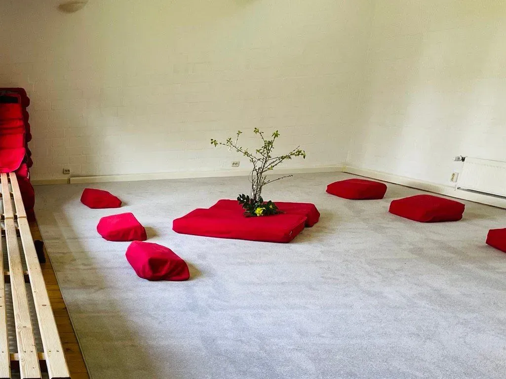 Von dort gelangen Sie in den großen, hellen Atelierraum (55 qm, nicht möbliert), der eine besondere Atmosphäre ausstrahlt. Auf den Holzdielen nur ein Schafwollteppich. Dazu eine Beleuchtungs- und Musikanlage. Von den großen Fenstern blicken Sie auf die Terrasse und den Wiesenhang. Ob Theater, Meditation, Yoga oder therapeutische Arbeit, mit den beweglichen Polstern können Sie nach eigenen Wünschen den Raum nutzen und gestalten.