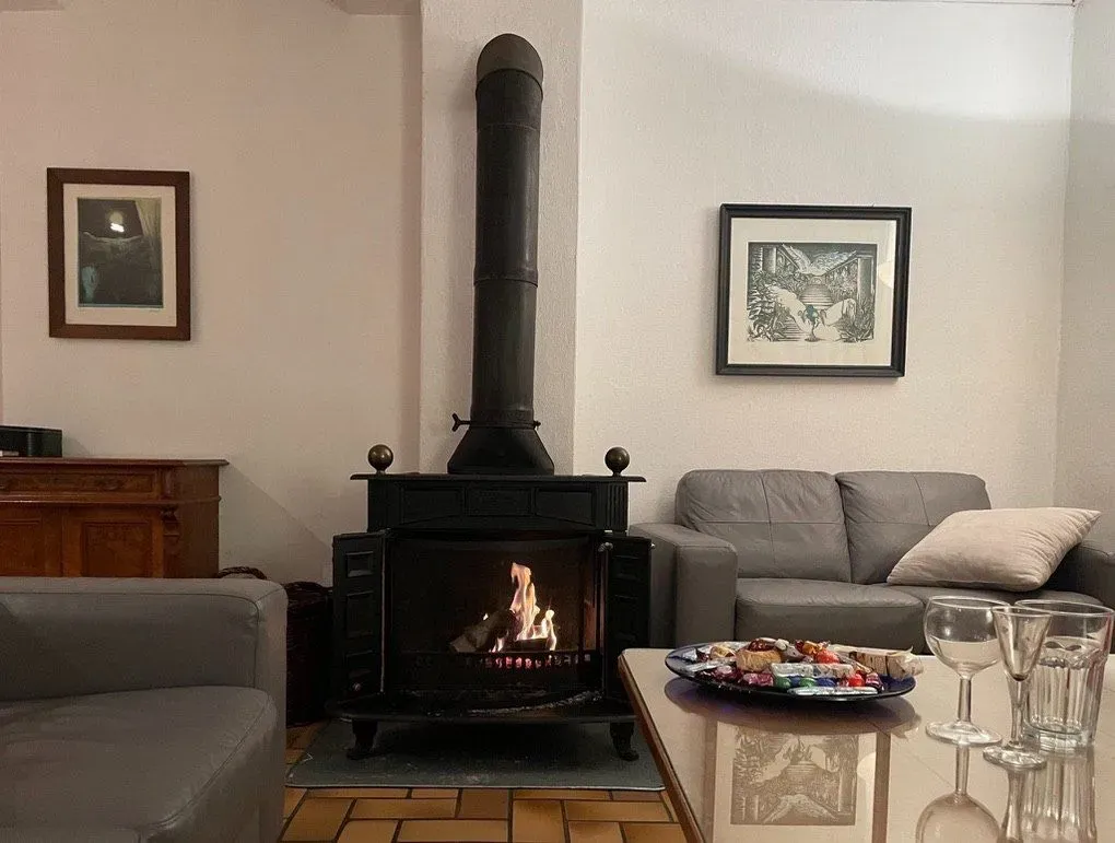 Der gemütliche Aufenthalts- und Essraum ist 40 qm groß. Abends bei Kerzenlicht vor dem Kaminofen sitzen und ins Feuer sehen? Auf die Nachrichten aus der weiten Welt brauchen Sie nicht zu verzichten. Dazu steht in einem kleineren Raum ein Fernsehgerät mit Satellitenempfänger sowie ein DVD-Player bereit.
